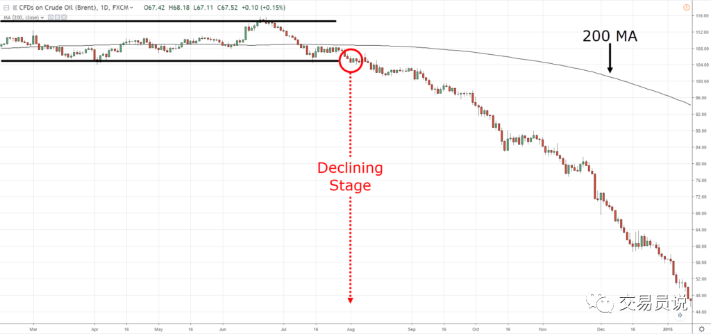 这是市场周期的最后阶段。下跌阶段(Declining stage)发生在分销阶段的价格崩跌时,它是一个存在一系列的高点和低点的下降趋势。
