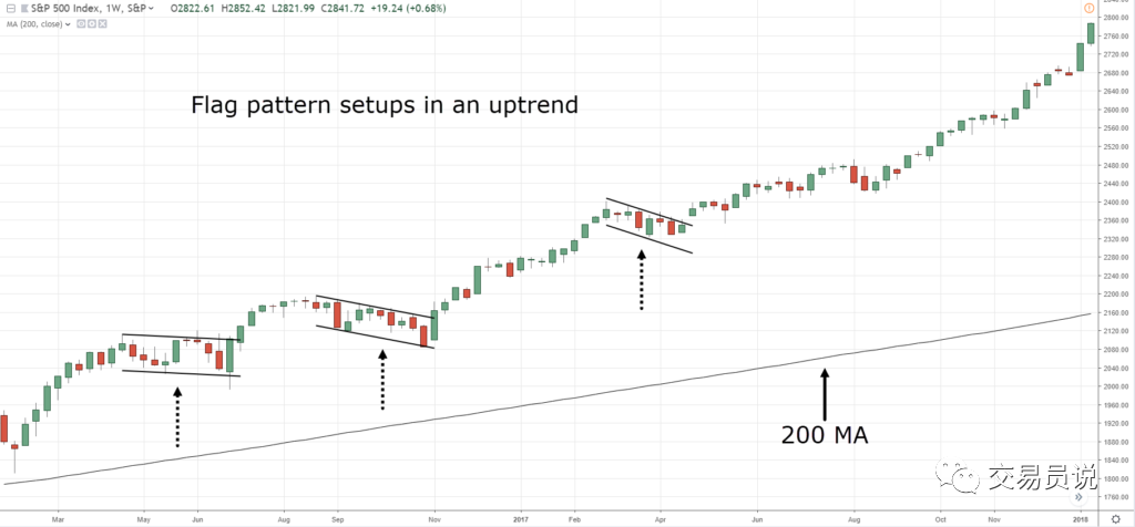 因此,在上升趋势中,你可以寻找看涨旗形形态并在高点突破时买入。在下降趋势中,寻找看跌旗形态并做空低点突破。如下图: