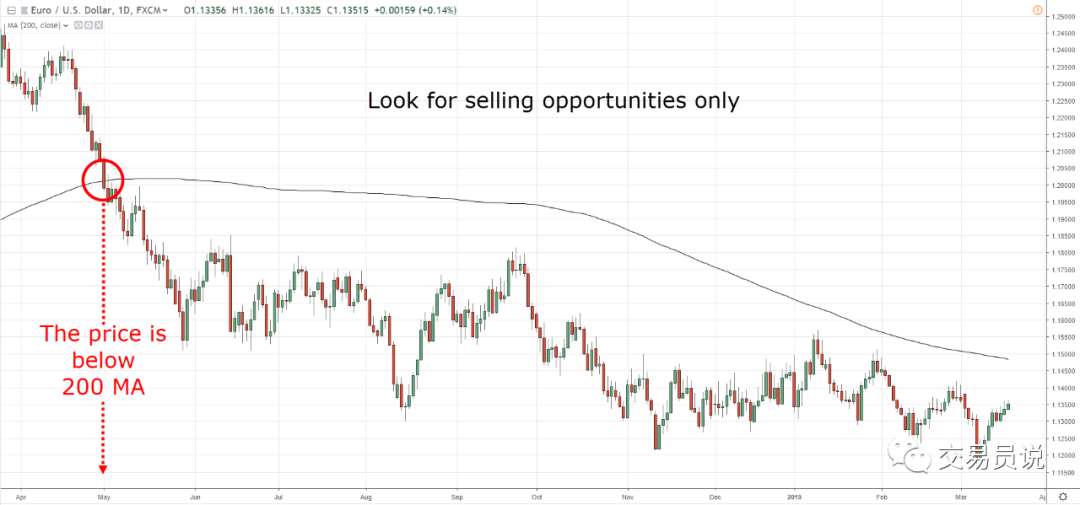 在这个阶段mt4怎么玩教学,大多数交易者可以识别趋势并寻找卖出机会。此时,你将看到价格低于200日均线并且200日均线开始指向更低。看下面一个例子: