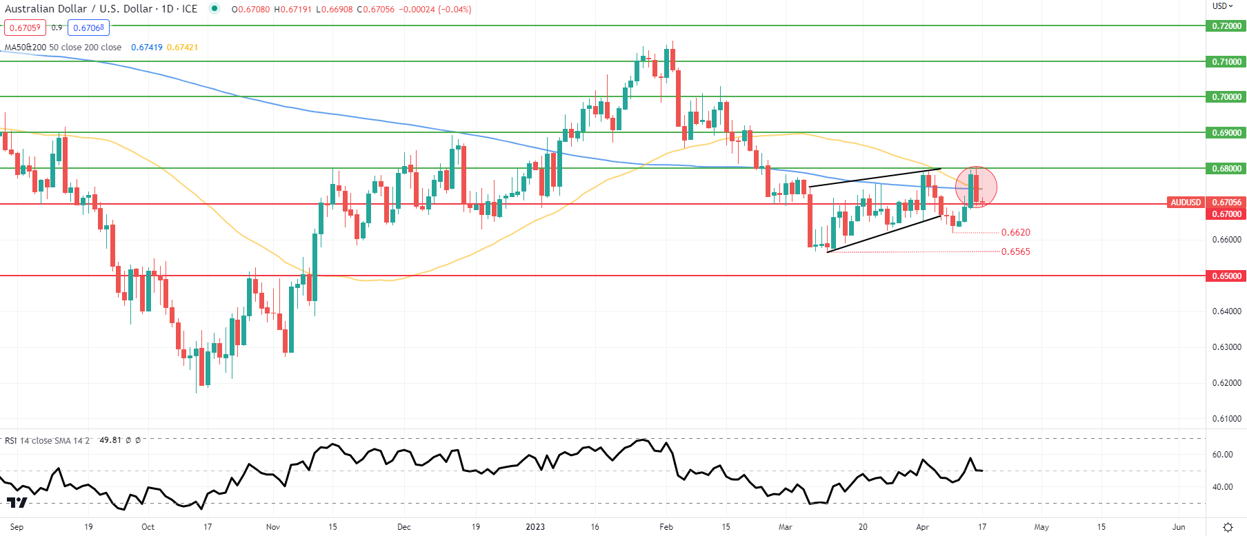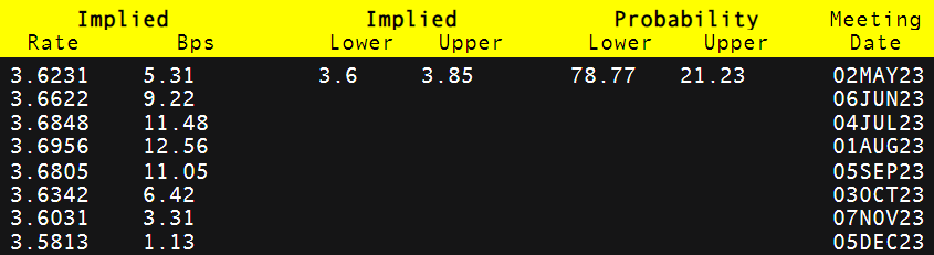 此外,周二澳储行会议纪要公布也引发关注。澳储行在上一次利率决议决定维持利率在3.6%不变,以观望全球经济趋势发展并等待澳洲最近经济数据,尤其是通胀和就业数据公布。如下图所示,货币市场目前押注澳储行将在5月份会议上继续暂获加息步伐,维持利率不变的概率为78.77%。考虑到联准会可能在5月份会议加息25基点,这可能会刺激套利交易兴趣上升,从而令澳元承压。