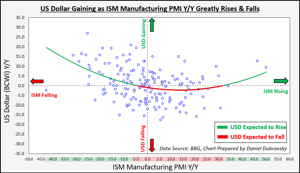 现在让我们看一下ISM制造业PMI,以衡量工业部门的活动对美元的影响。在这里你也可以找到一个“U形”关系。似乎美元的“危险”区域是当这个指标的同比表现在-5%到+30%之间。在这个范围之外的结果似乎为美元的上行打开了大门。