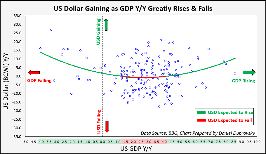 你能发现下面GDP和美元之间的“U型”关系吗?这是数据验证美元微笑理论的一种表现。该曲线可以分解为左右两个绿色区域(在GDP给定值的情况下,美元预计会上涨),以及一个红色区域(美元预计会走弱)。在1.5%-4.0%之间的GDP年增长率是美元的“受损”区,或者说该区域内,美元预计将相比一年前下降。在这个范围之外的GDP数据显示美元平均而言在上升。