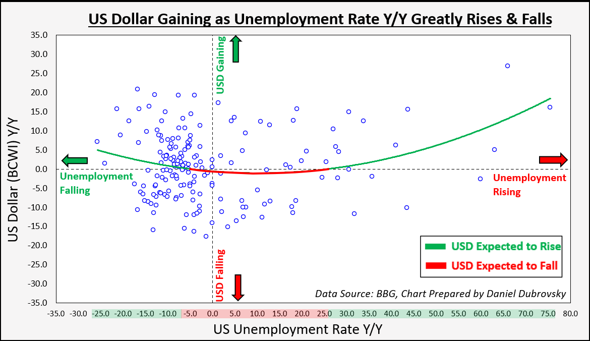 在这个数据中,似乎美元的“危险”区域是当失业率同比表现在-5%和+25%之间的时候。当这一经济指标在这一范围之外时,美元在历史上往往会上涨。
