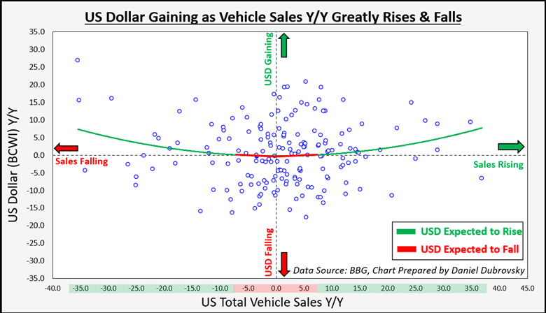 最后,我将观察新车销售总量的同比表现与美元的关系。就像GDP、失业率和ISM制造业PMI一样,你也可以看到它与美元的“U型”关系。当车辆销售同比表现在-7.5%和+7.5%之间时,就会出现美元的“危险”区域。同时,当数据在这个区域之外时,美元平均而言倾向于升值。