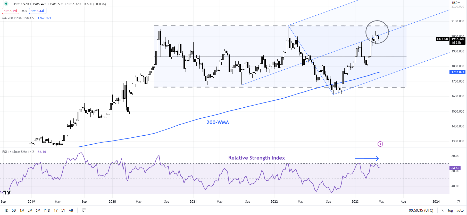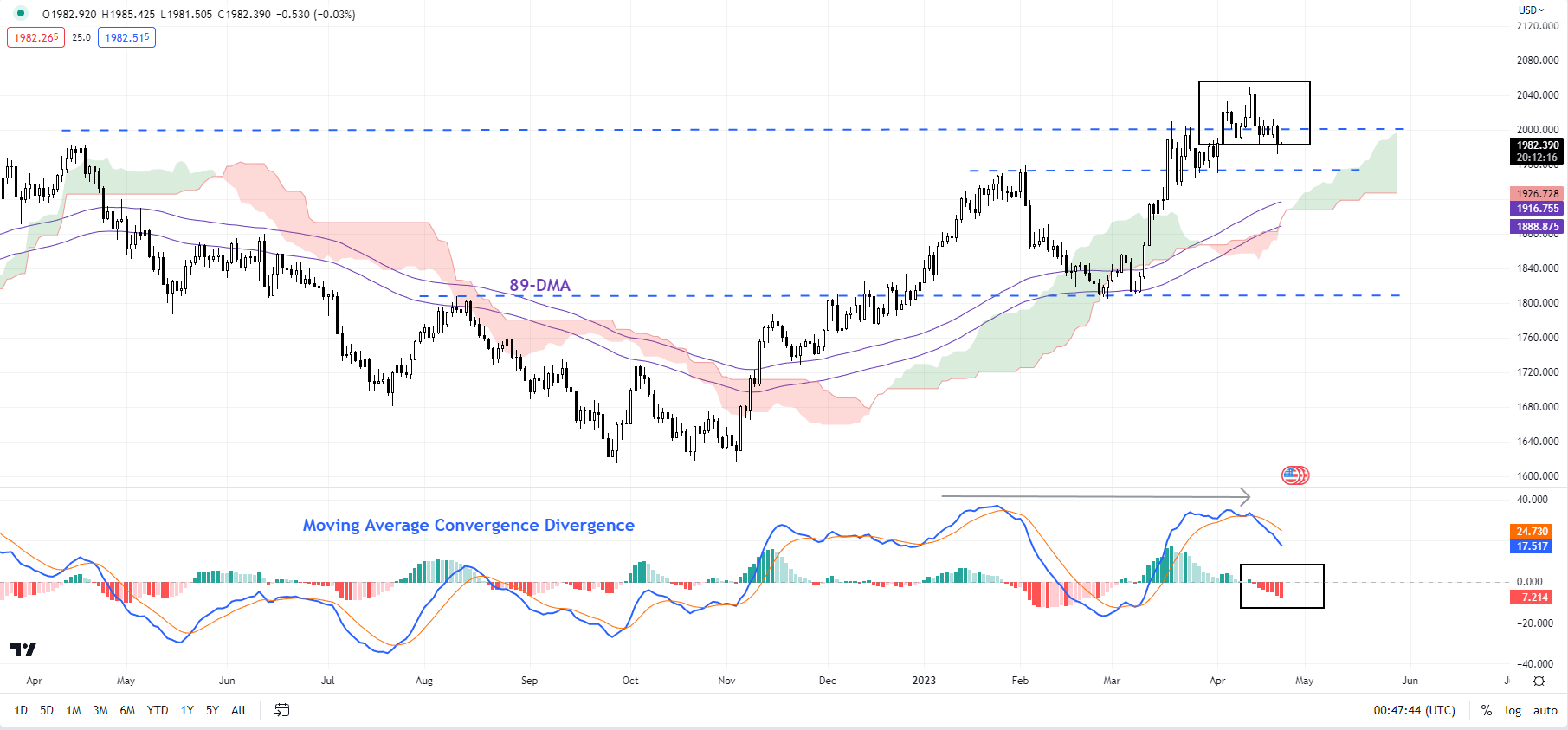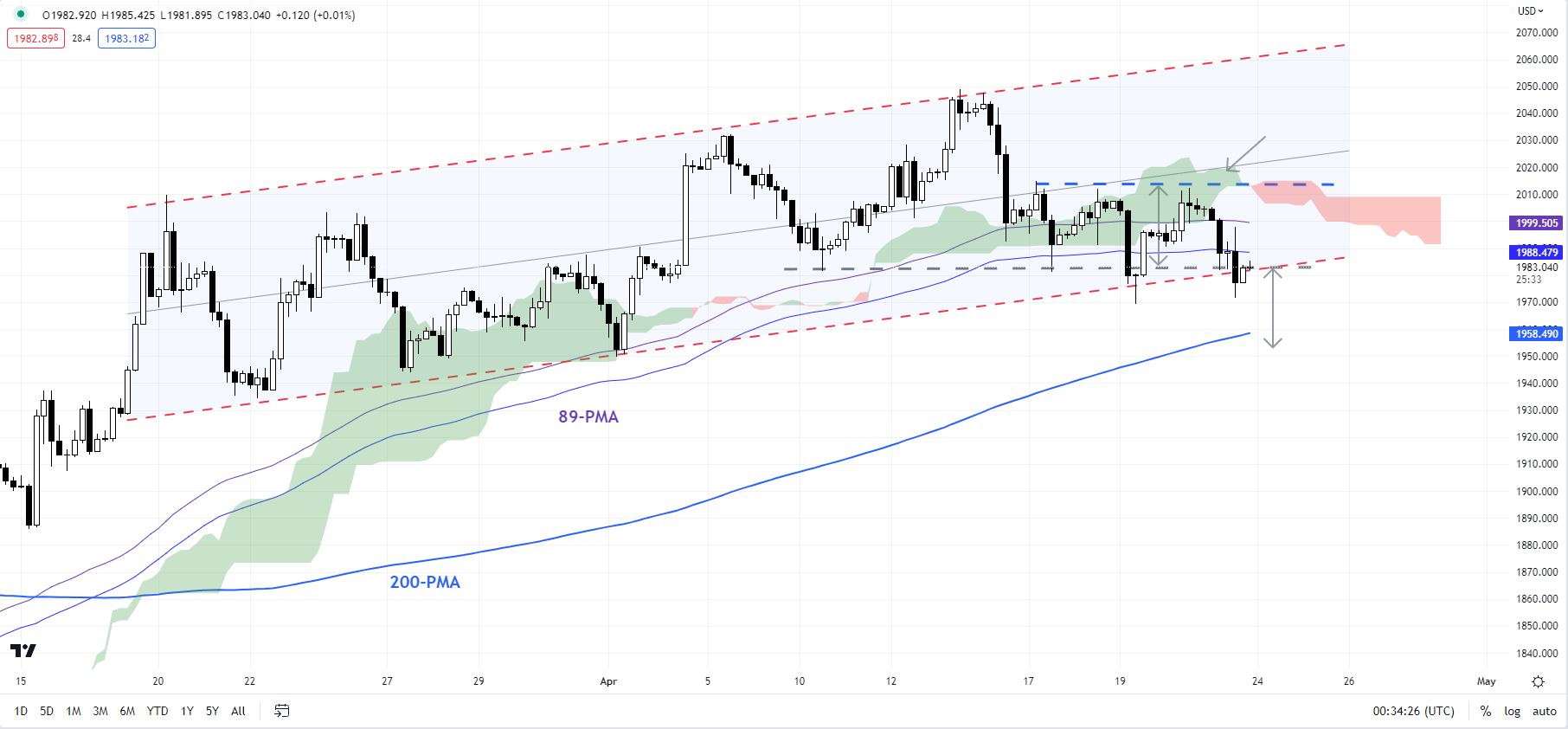 不过,若通胀数据出现任何上行的迹象都可能会提振美债收益率及美元,从而施压黄金。数位美国联准会(即美联储/FED)官员近期公开表示将再升息一码(25个基点)。根据CME美联储观察工具(FedWatch tool)市场目前押注美国联准会有89%的概率於5月再升息一码。另一方面,若PCE通胀数据差於预期,届时这可能会推动黄金重返2000美元关口之上。