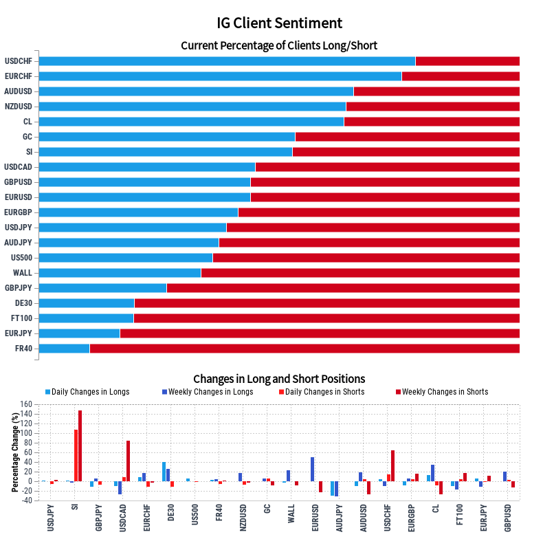 欧元/瑞郎:近75.53%的客户为净多头,净多头和净空头的人数比率为3.09∶1。净多头人数较昨天上升8.48%,较上周上升17.76%。净空头人数较昨天下降12.12%,较上周下降3.33%。情绪指数通常作为反向指标,多数散户持有净多头暗示欧元/瑞郎可能下跌。并且净多头持仓量相较昨天和上周都进一步增加,结合当前散户情绪以及最新持仓量变化,欧元/瑞郎走势前景更加看跌。