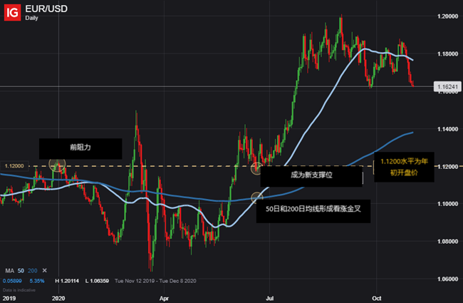 技术支撑位和阻力位可以用许多不同的方式来识别,而这使它们的位置可能相对主观。因此,对交易者而言,谨慎的做法可能是将更多的注意力放在关键的价格拐点上,因为这些拐点位置定义较为客观。除了震荡高点和震荡低点外,这些潜在的拐点也可通过开盘和收盘价决定。在下方的欧元/美元日线图中,著重标示2020年年初开盘价格1.1200一线。这一前阻力转化成的支撑在本年度晚些时候成为欧元/美元出现大幅反弹的水平。