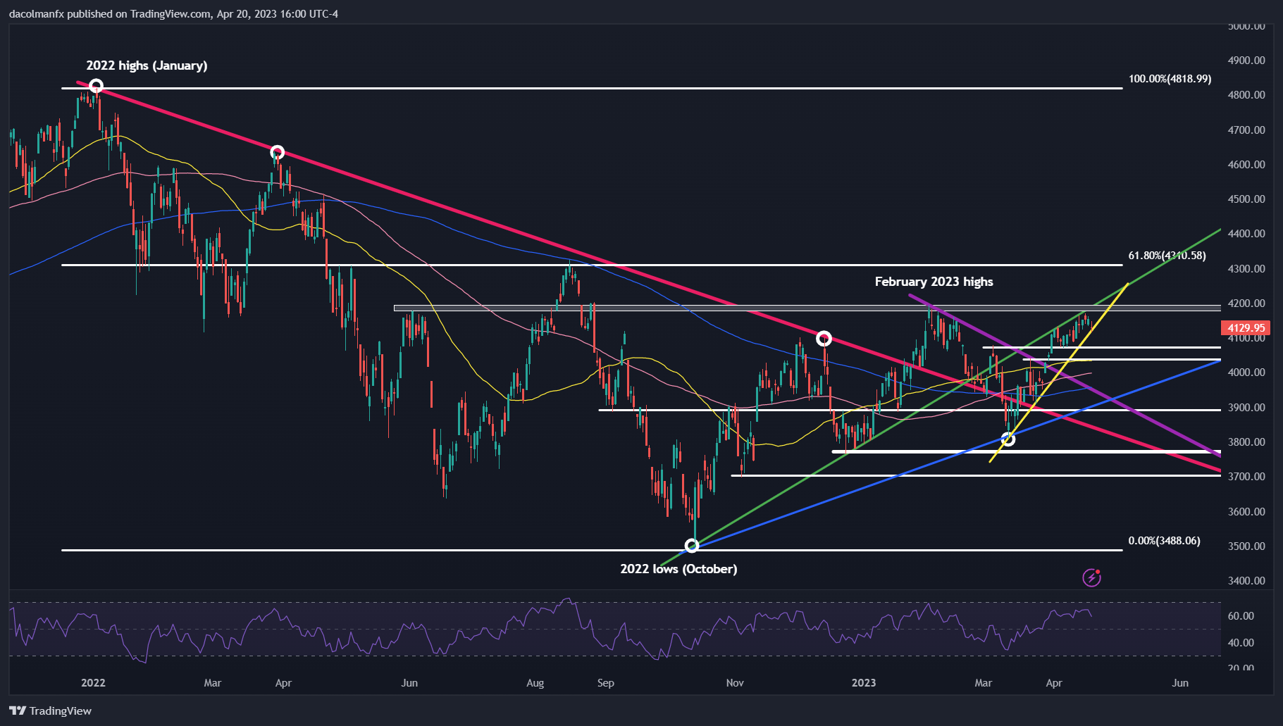 从技术角度来看,标普500指数目前继续卡在两条趋势线之间,如上图所示,上面的那条绿色趋势线作为阻力,下面的那条黄色趋势线作为支撑。在周四的回调之后,该指数似乎即将测试趋势线4,100点。如果跌破该趋势线,则可能会进一步跌向4,075,然后是4,035。