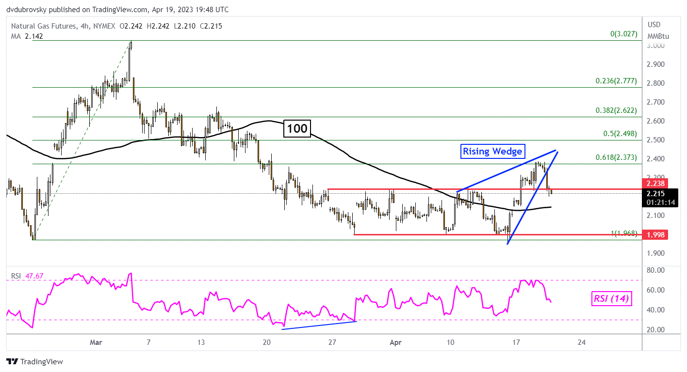 周三(4月19日),天然气价格下跌8.33%,结束了为期3天的上涨。在这次上涨之前,技术指标RSI底背离已暗示下行动能在消退,随后走势反弹。不过,天然气价格更广泛的下行压力仍然存在。